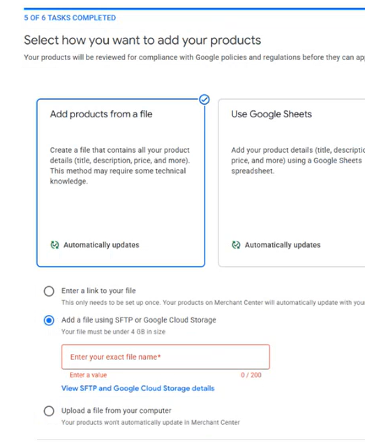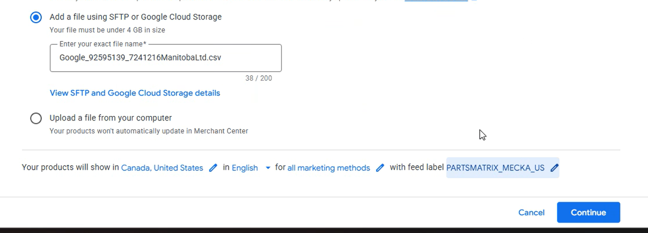 Add a file using SFTP or Google Cloud Storage - enter the file name here that was created by Mecka.