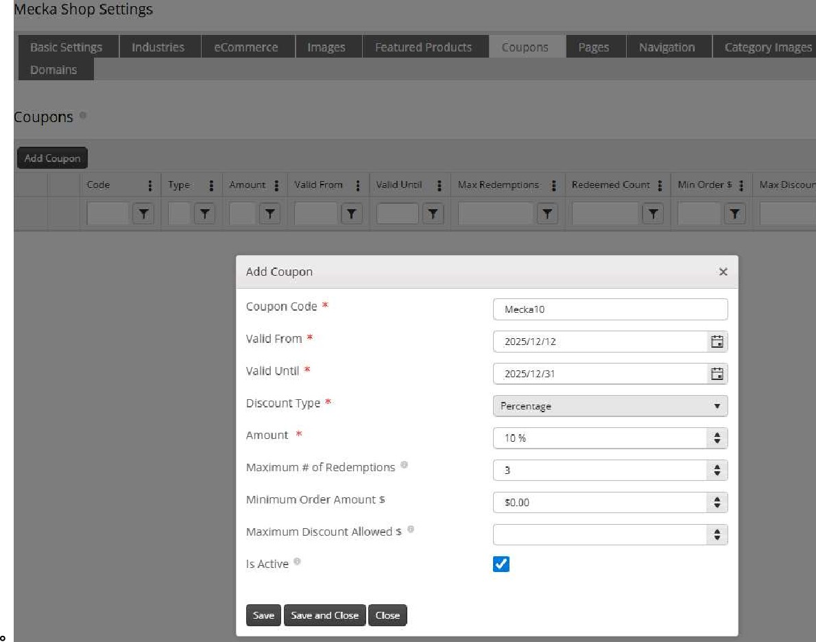 Work Item #4415 - Mecka B2B UI/API: Discount/Coupon Management tab o Summary: Added a new Discount/Coupon Management tab to B2C Shop Page for creating, editing, viewing, and soft-deleting coupons (list/detail UI + APIs).